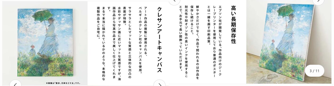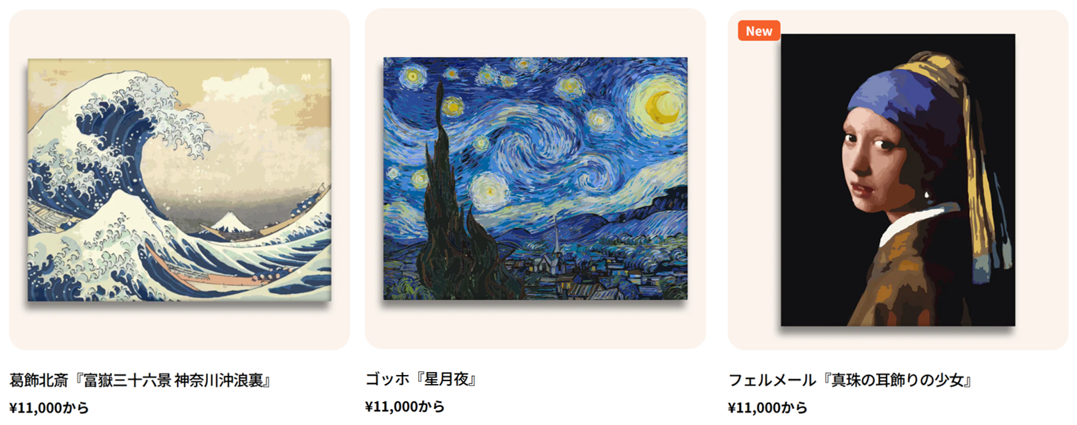 オリジナルの写真などで良いのがないという人や名画の模写から練習で始めたいということも可能で、ゴッホやフェルメール、葛飾北斎など19点の有名画もあるのでこちらから始めてみるのよいでしょう。こちらは既にオリジナル作成よりも値段も安く11,000円で自作絵画を作ることができます。