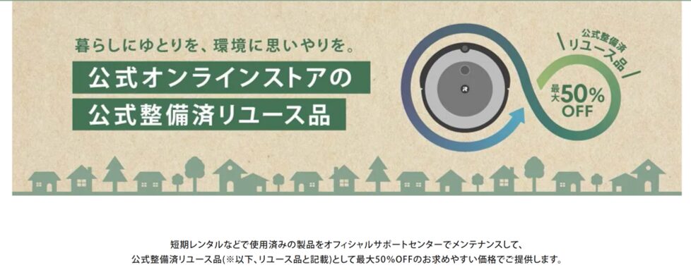 アイロボットでは短期利用目的の人のためにレンタルプランなども用意しています。その商品を回収し公式整備した商品を最大50%オフにて販売しています。