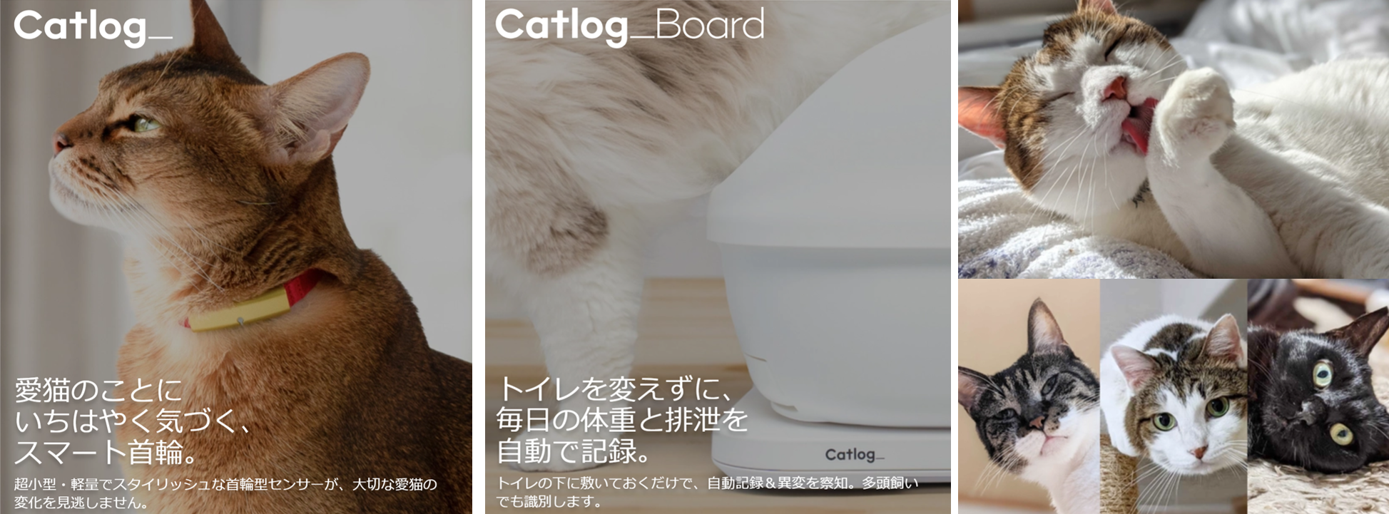 株式会社RABOでは猫の行動記録をデータ化することができるキャットログという商品を販売しています。商品は首輪型デバイスとトイレの下引くボードの2種を販売しています。