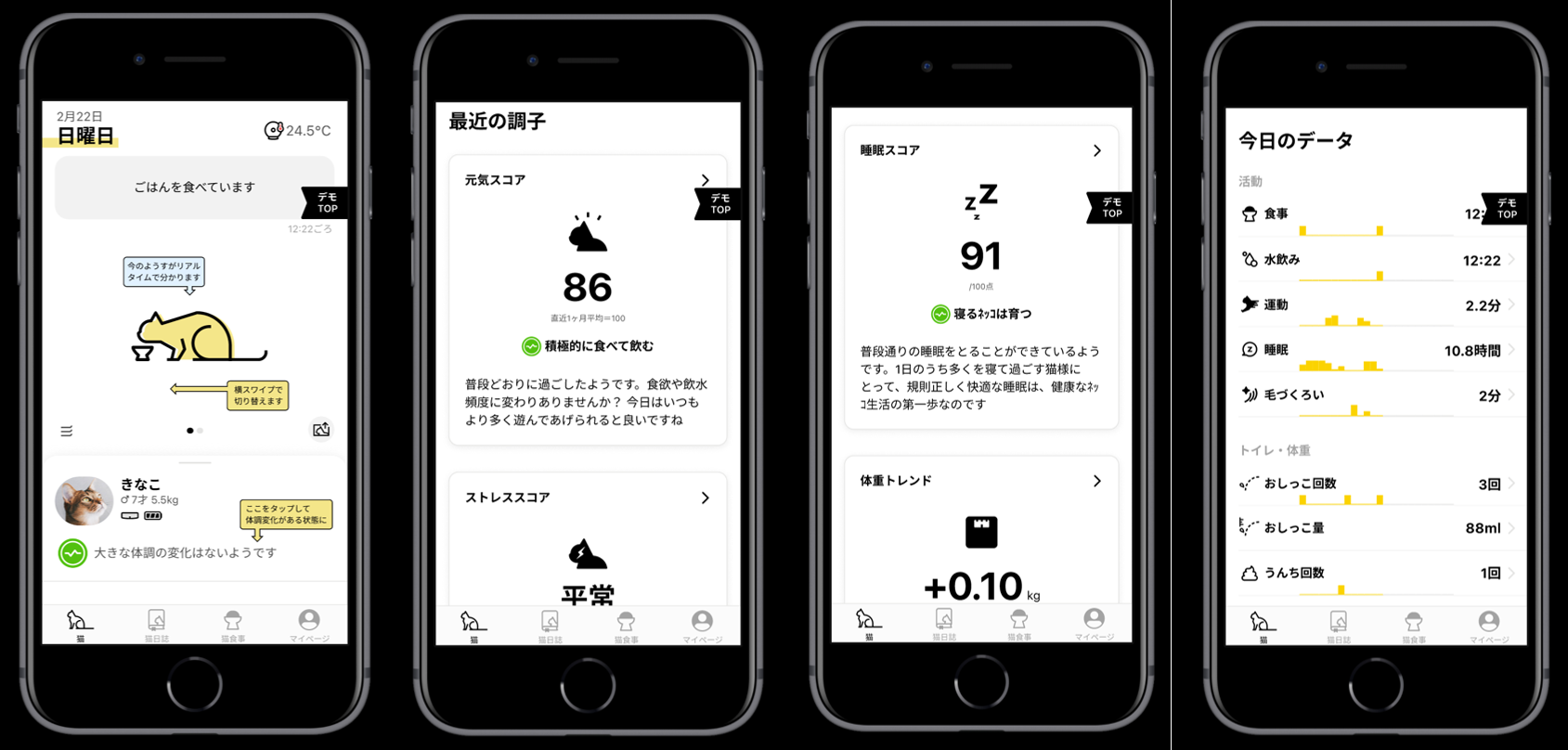 首輪型デバイス(キャットログ)では食事・水飲み・運動・歩行・睡眠・嘔吐などを識別し行動ログを取っていくことができ、ログデータはアプリから確認することができます。