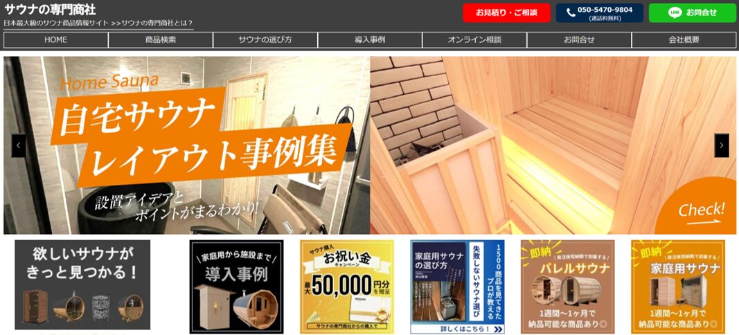 サウナの専門商社ではサウナ関連商品を豊富に取り揃えているサイトです。サウナハットやサウナ用ウェアだけでなく自宅用サウナまで販売しています。