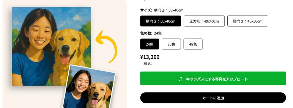 サイズは「①50×40 ②40×40 ③40×50」の3種となり、料金は選ぶ色の多さで変わります。24色で13,200円、36色が14,300円、48色だと15,400円とい具合です。