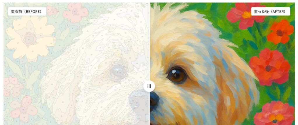 写真をアップロードすると下絵と色番号が付いた台紙が送られてくるのであとは指定された色通りに色を付けていけば一枚の絵画が完成するというものです。