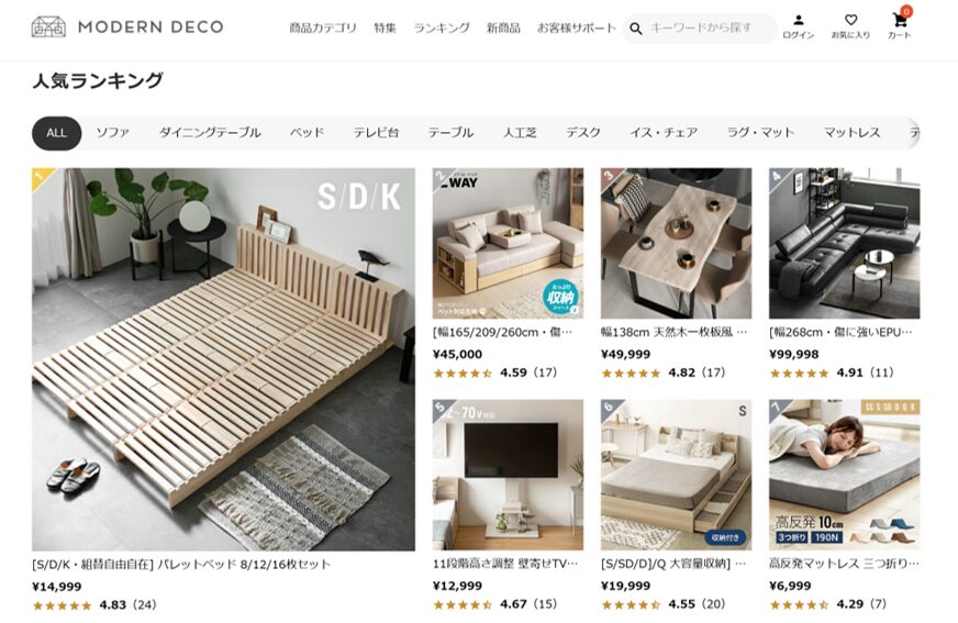 モダンデコは男性向けの高さの低いロータイプの家具なども種類も豊富で基本色味を落ち着いたものが多く、値段も手の届きやすい価格帯になっているので家具選びで失敗の可能性が低いショップです。