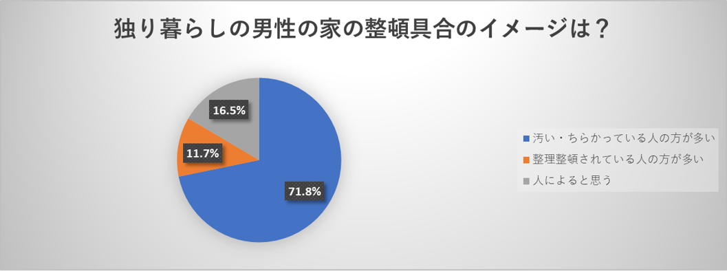 自宅にあったら男性の評価が上がるアイテム調査の9位には「花・観葉植物」がランクインしました。同調査からも一人暮らしの男性の宅のイメージとして7割の女性が「散らかっていそう」と回答しています。